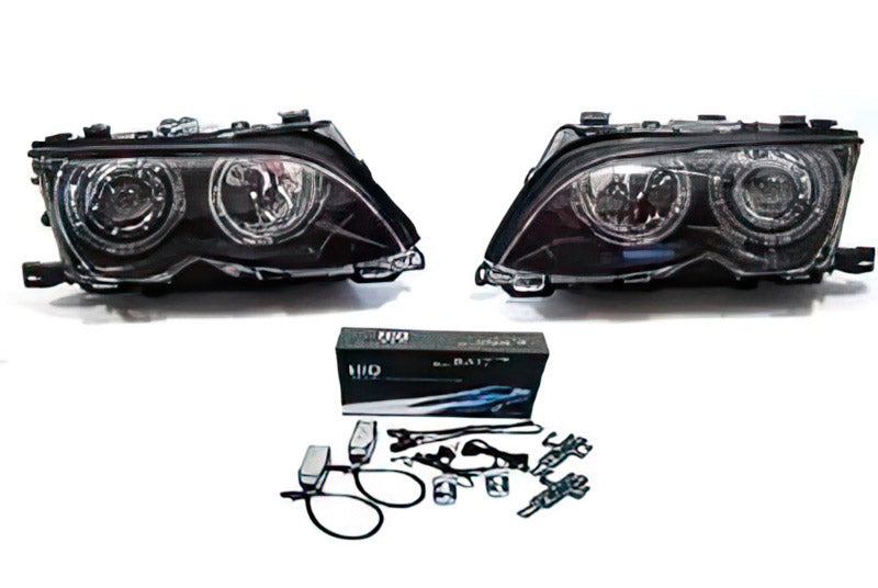 MStyle angel eye headlamps OE quality with xenon conversion kit, various bulb colour ratings available. For all E46 saloon/touring models 2001 on facelift. Headlights have black inners, silver/chrome available on request.