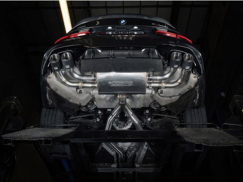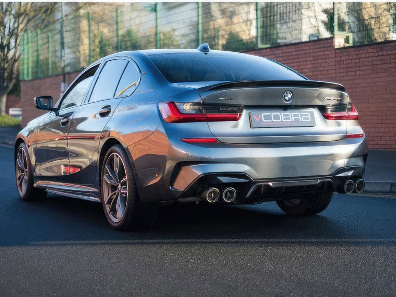 Cobra Sport performance exhausts enhance the sound, looks and quality of your vehicle giving you the ultimate driving experience. Our sports exhausts range is fully guaranteed to give you assurance of our quality. This BMW M340i (G20/G21) performance exhaust is made in 3"/76.2mm pipework and fits from the GPF section backwards (GPF-back), this exhaust replaces the centre and rear sections. Single Valved GPF Back Test Results - Sport mode: Engine at Idle: 65.9dB (+7.6dB) | Static 4,000rpm test: 88.1dB (+6.2dB) Twin Valved GPF Back Test Results - Sport mode: Engine at Idle: 61.7dB (+3.4dB) | Static 4,000rpm test: 87.8dB (+5.9dB) This exhaust removes the factory exhaust outlets and replaces them with a choice of quad exit exhaust tailpipes enhancing the styling of the rear of the car. This setup is available in two options: The twin valved setup includes an intricately designed larger rear silencer to fully utilise the M340i's built in drive modes, allowing the exhaust to change from quieter cruising tones in comfort mode to much louder tones in sport mode. The single valved setup includes a smaller and louder 'race' style rear silencer for a larger upgrade in overall sound in all drive modes. This setup offers improved sound and louder tones in all drive modes. All relevant fittings and gaskets are supplied.