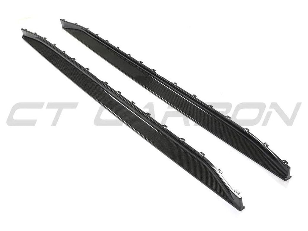 CT Carbon replacement side skirt for the new BMW M3 G80 & G81. Made from high-quality ultra lightweight pre-preg carbon fibre which will completely replace the black plastic side skirts on the car & give you the extensiuon look in one.